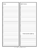 Avoid overpacking for a business or personal trip with the help of this blank list with room to note what to pack and what not to pack. There is also room to list items to purchase upon arrival at a destination.